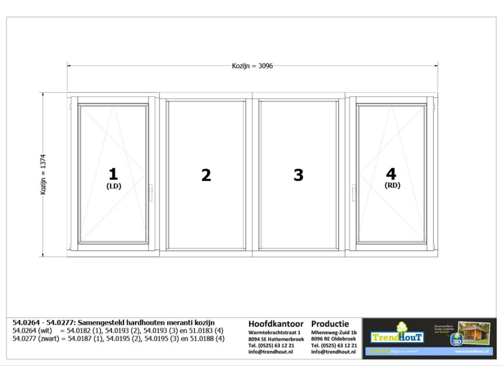 • Combinatieset Meranti raamkozijn 3096x1374 - Zwart - draai/kiep (LD) + 2x vast + draai/kiep (RD)