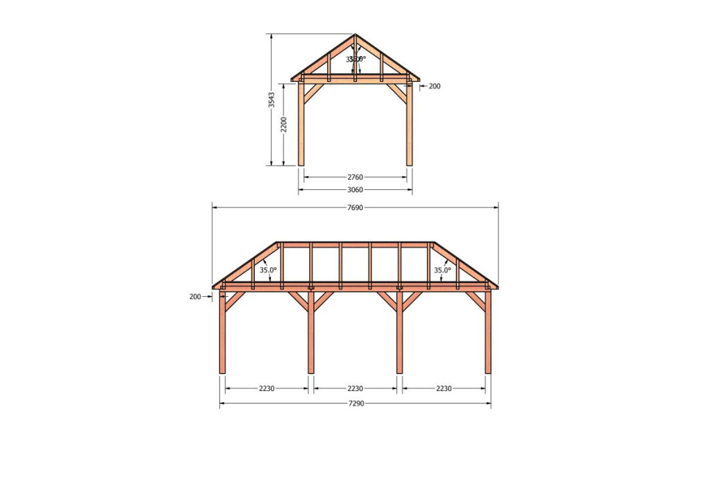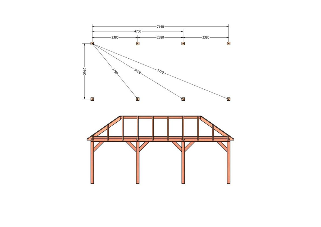 • Constructiepakket schilddak | 7690x3460x3760mm | fijnbezaagd Douglas