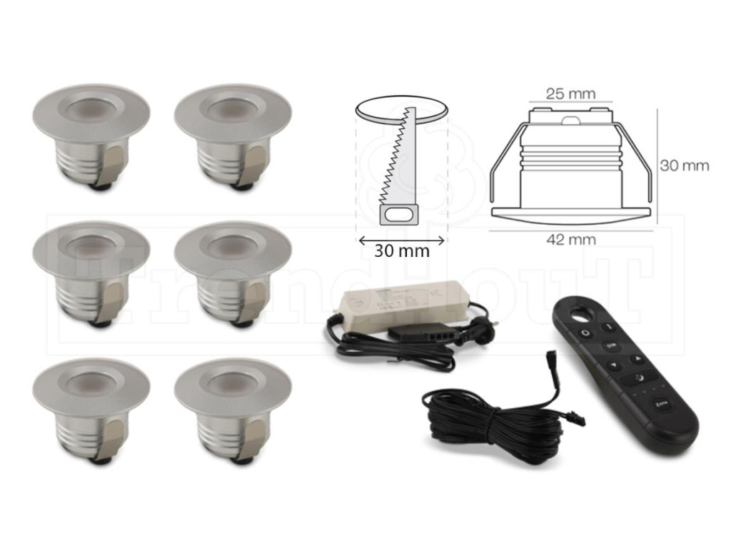 Led verlichting RVS inbouw 42mm set á 6 stuks incl. transformator, afstandbediening en kabels