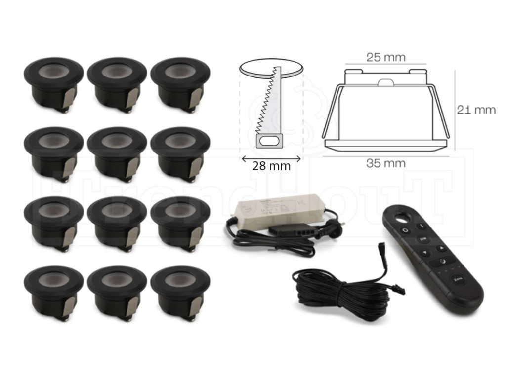 Led verlichting zwart inbouw 35mm set á 12 stuks incl. transformator, afstandbediening en kabels