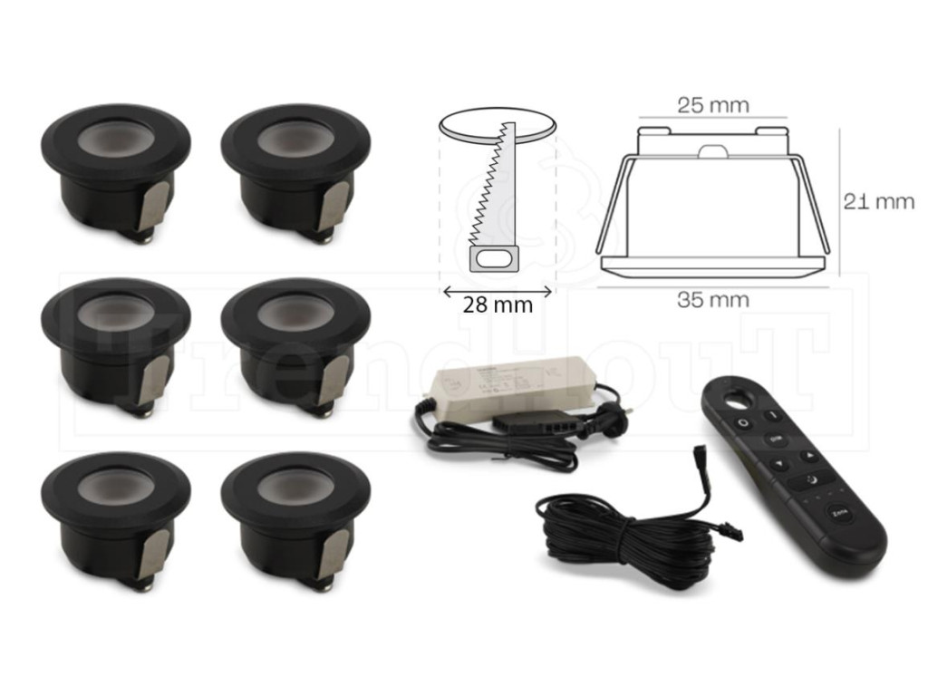 Led verlichting zwart inbouw 35mm set á 6 stuks incl. transformator, afstandbediening en kabels