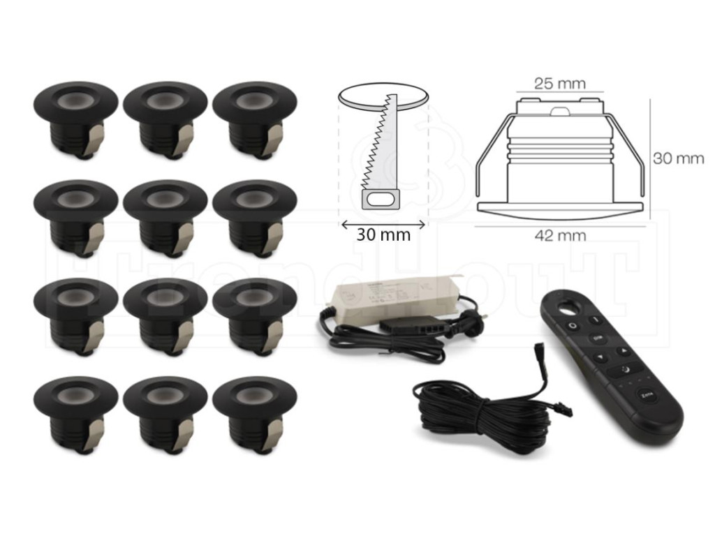 Led verlichting zwart inbouw 42mm set á 12 stuks incl. transformator, afstandbediening en kabels