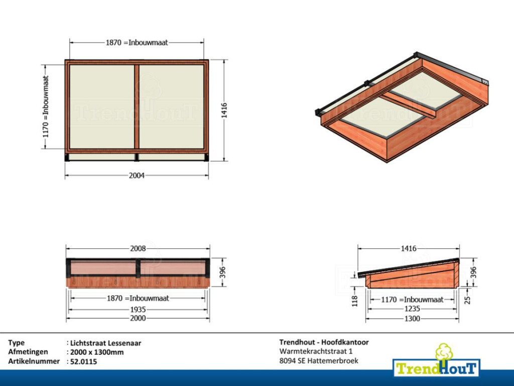 • Lichtstraat lessenaar 2000mm, 1300mm diep incl. gelaagd isolatieglas en profielen