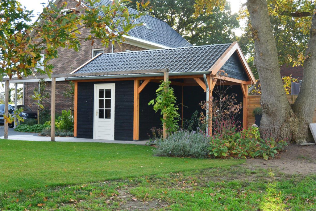 Zadeldak XL is een premium zadeldak met sporenkap. De constructie is snel en gemakkelijk op te bouwen, o.a. door de voorgeboorde schroefgaten en op lengte afgekorte onderdelen, en doordat er zwaluwstaartverbindingen zijn toegepast. De voorgeboorde schroefgaten kunnen keurig worden afgewerkt met de bijgeleverde houten doken. De robuuste 145x145mm staanders en ringbalken