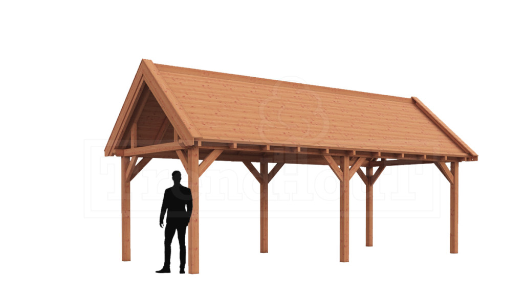 Zadeldak XL is een premium zadeldak met sporenkap. De constructie is snel en gemakkelijk op te bouwen, o.a. door de voorgeboorde schroefgaten en op lengte afgekorte onderdelen, en doordat er zwaluwstaartverbindingen zijn toegepast. De voorgeboorde schroefgaten kunnen keurig worden afgewerkt met de bijgeleverde houten doken. De robuuste 145x145mm staanders en ringbalken