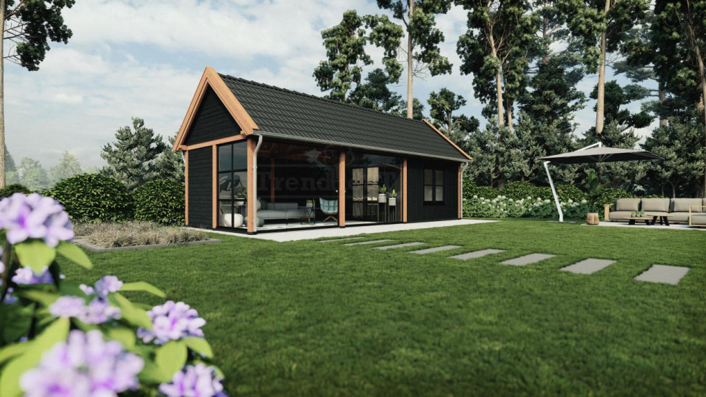 Dit buitenverblijf is als bouwpakket samengesteld en het laten opbouwen door Trendhout is een optie.