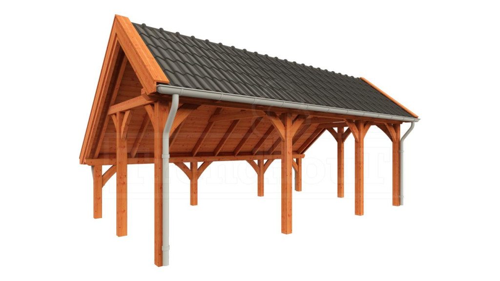 Kapschuur De Hoeve XL is een premium kapschuur met sporenkap. De constructie is snel en gemakkelijk op te bouwen, o.a. door de voorgeboorde schroefgaten en op lengte afgekorte onderdelen, en doordat er zwaluwstaartverbindingen zijn toegepast. De voorgeboorde schroefgaten kunnen keurig worden afgewerkt met de bijgeleverde houten doken. De getoogde schoren en het asymmetrische dak geven de kapschuur zijn landelijke uitstraling.