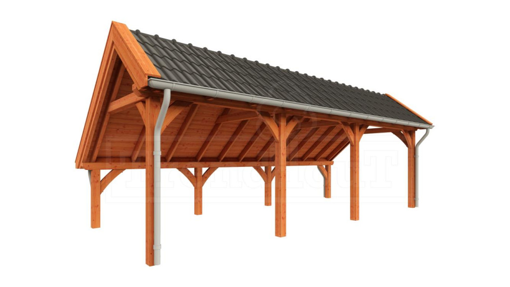Kapschuur De Hoeve XL is een premium kapschuur met sporenkap. De constructie is snel en gemakkelijk op te bouwen, o.a. door de voorgeboorde schroefgaten en op lengte afgekorte onderdelen, en doordat er zwaluwstaartverbindingen zijn toegepast. De voorgeboorde schroefgaten kunnen keurig worden afgewerkt met de bijgeleverde houten doken. De getoogde schoren en het asymmetrische dak geven de kapschuur zijn landelijke uitstraling.