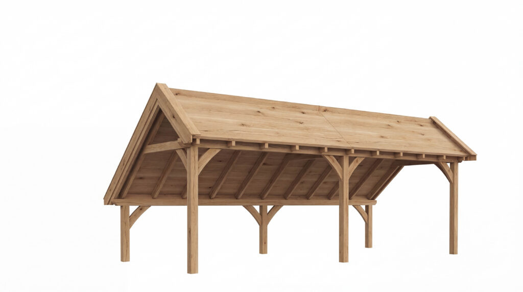Kapschuur De Veste is een karaktervolle eiken kapschuur met een traditionele sporenkap. De robuuste eiken constructie, gecombineerd met de getoogde klassieke schoren, zorgt voor een stoere en authentieke uitstraling. De geschaafde afwerking geeft het geheel een verfijnde, ambachtelijke look die perfect past in zowel landelijke als exclusieve buitenomgevingen.