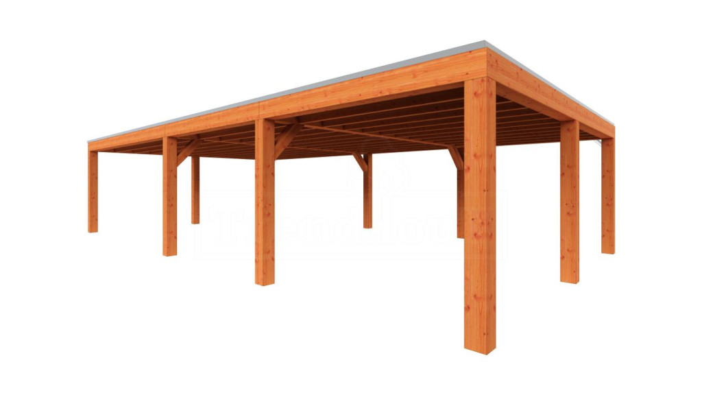 De constructie van de Palermo XXL dubbele Houten carport, met robuuste Douglas staanders van 19×19 cm, zorgt voor een sterke en duurzame bouw. Door de afwezigheid van een paal in het midden kun je gemakkelijk twee auto’s, boten of andere voertuigen plaatsen, waardoor je optimaal gebruikmaakt van de beschikbare ruimte.