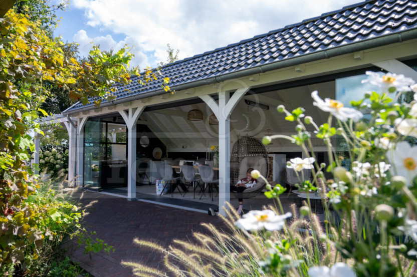 Tip: een eigentijdse keuze is om de constructie in een frisse witte tint te laten spuiten. Hiermee geef je de kapschuur een moderne uitstraling. De zwarte potdekselwanden, stijlvolle zwarte steel look raammodules, en de donkere dakpannen zorgen voor het gewenste contrast, waardoor deze kapschuur een bijzonder aangename sfeer uitstraalt.